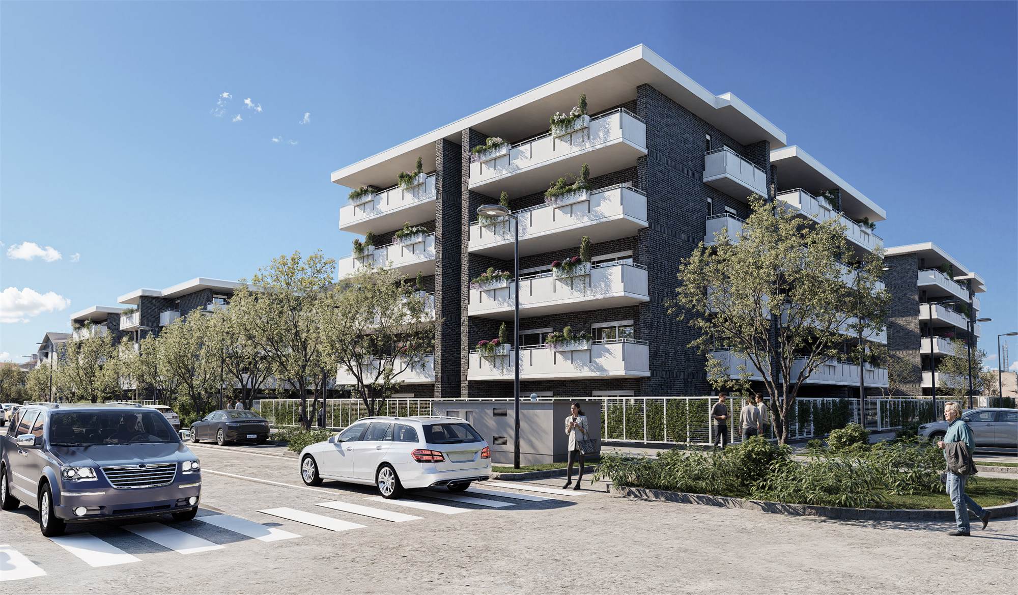 Proponiamo appartamenti di 2-3-4 locali che si sviluppano in piano terra con giardini privati, piani primo-secondo-terzo con splendidi terrazzi loggiati per un totale di 3 uffici e 29 abitazioni oltre cantine e box doppi.
