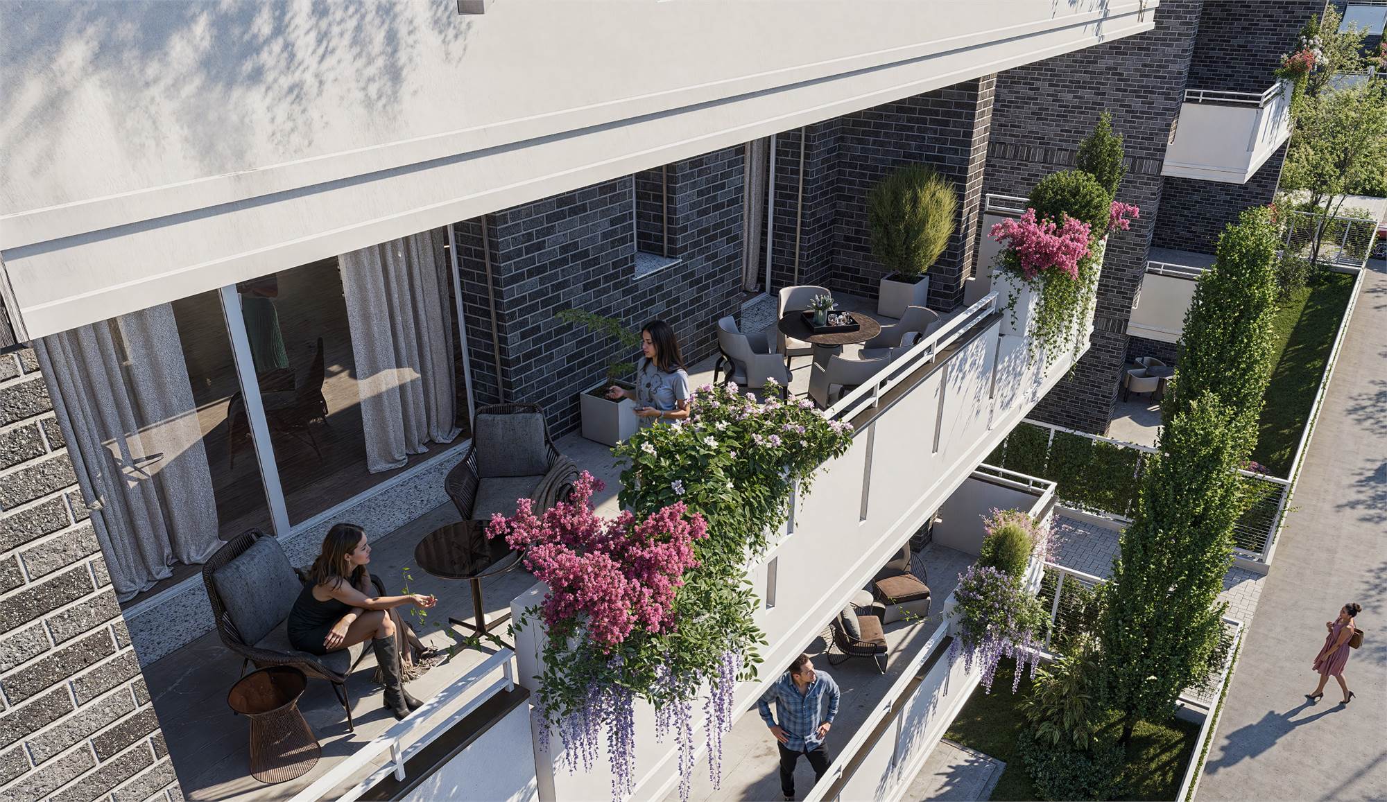 Proponiamo appartamenti di 2-3-4 locali che si sviluppano in piano terra con giardini privati, piani primo-secondo-terzo con splendidi terrazzi loggiati per un totale di 3 uffici e 29 abitazioni oltre cantine e box doppi.
