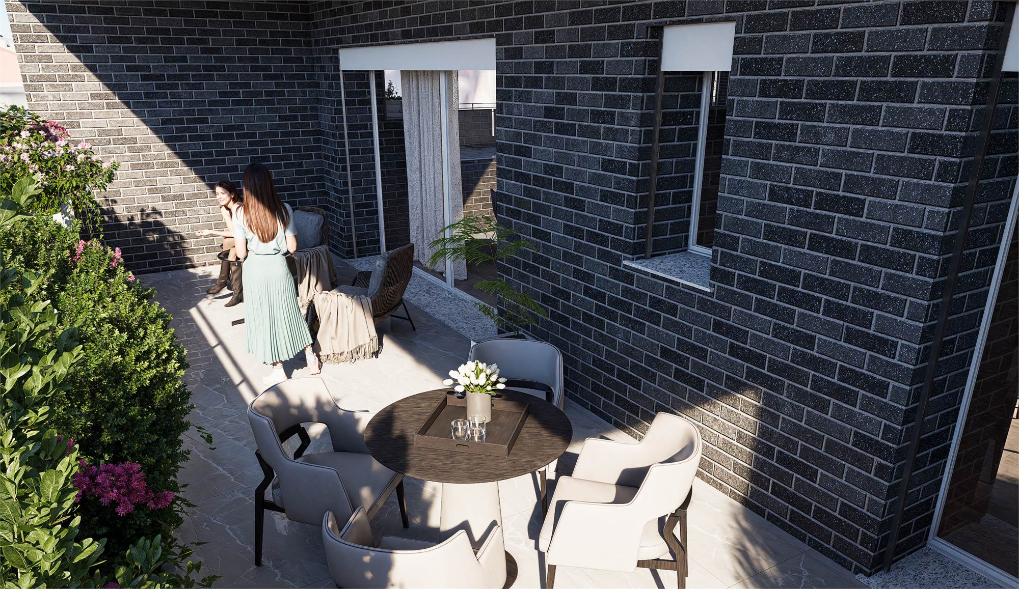 La Palazzina, munita di ascensore in assenza di barriere architettoniche, verrà realizzata con le ultimissime tecniche costruttive nel pieno rispetto delle recenti normative antisismiche e nel pieno rispetto del contenimento energetico. Facciate in mattoni faccia a vista S. Anselmo color grigio tortora abbinate a parapetti in cemento martellinato garantendo un’estetica elegante e contemporanea.